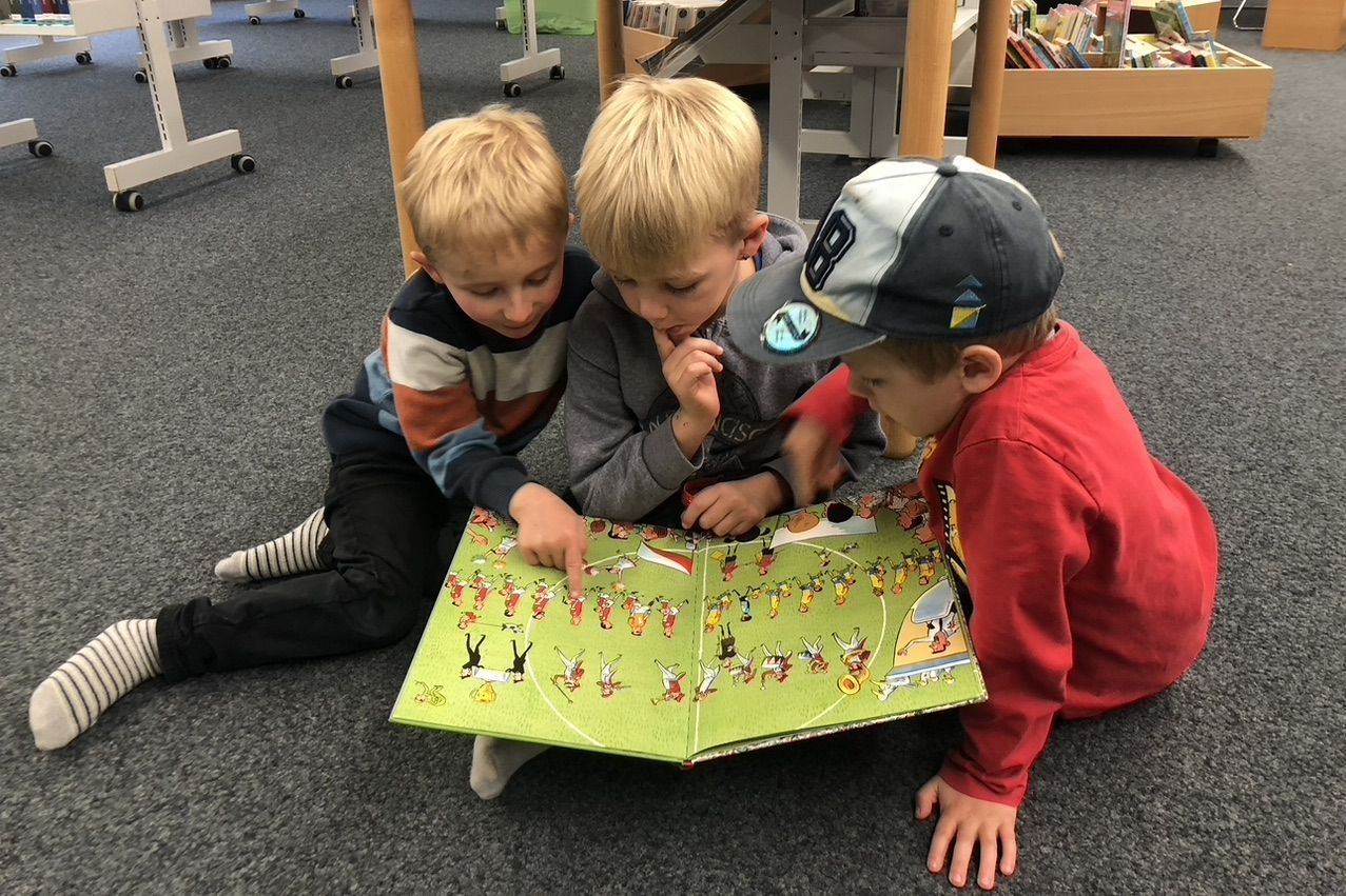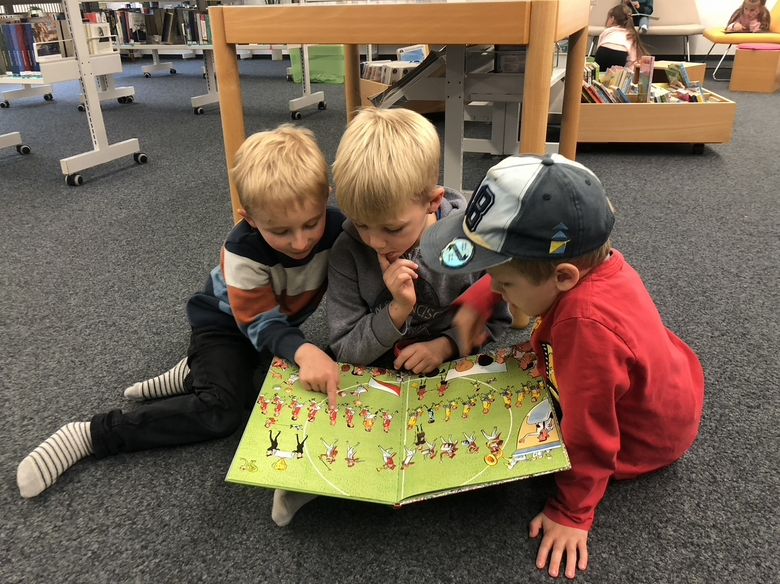 Mit Sorgfalt und Respekt, ganz wie es uns Frau Hirt gezeigt hat, bewegen sich die Kinder durch die vielen Regale und wissen zuerst gar nicht recht wo anfangen. Doch einmal aufgetaut, sind sie kaum noch zu bremsen und ziehen immer wieder neue Bücher aus den Fächer. Alleine, zu zweit oder in ganzen Gruppen vertiefen sie sich in ein Buch und erzählen angeregt was ihnen entgegen kommt. Immer wieder entstehen enorm schöne Momente des Staunens, des Wiedererkennens und einfach der Freude über die verschiedenen Entdeckungen zwischen zwei Buchdeckeln.