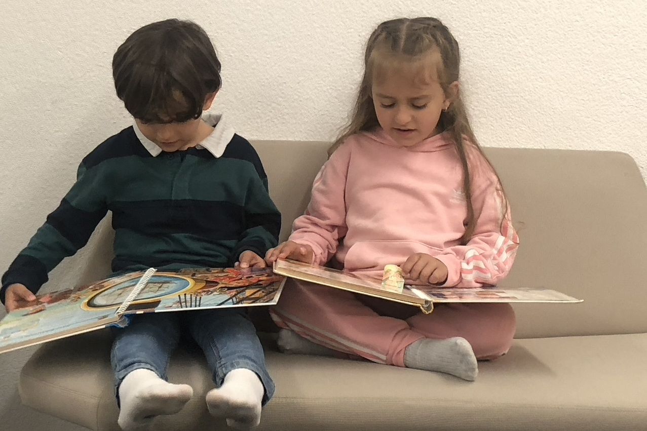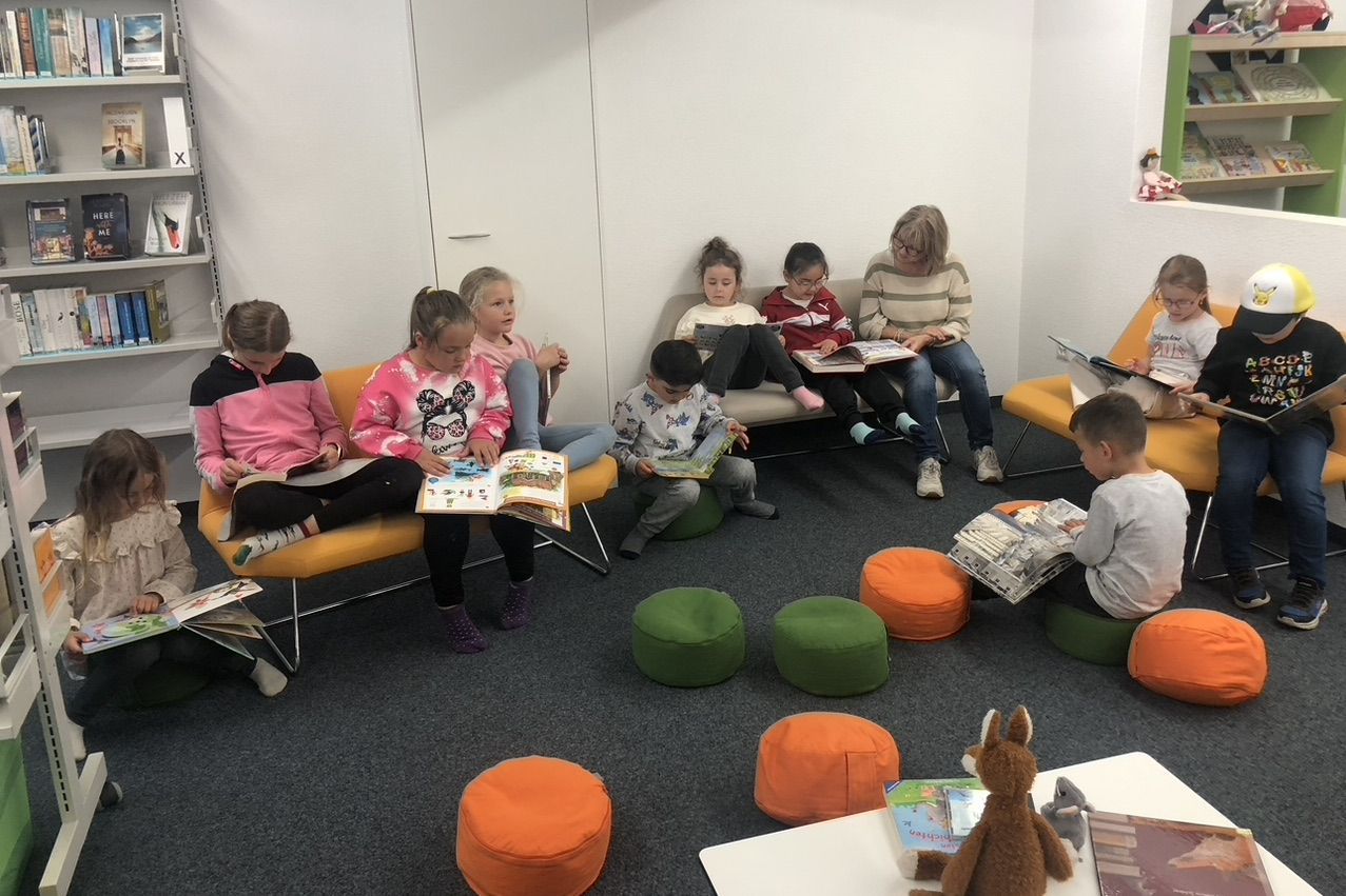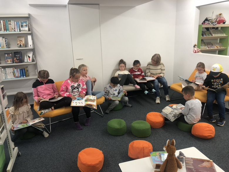 Normalerweise ist die Türe nicht offen, wenn das rote Schild an der Eingangstafel hängt, denn rot heisst Stopp oder eben geschlossen. Doch für uns ist heute trotz geschlossen offen, denn wir haben eine Einladung. Eine persönliche Einladung von der Bibliothekarin Susanne Hirt. Sie empfängt uns freudig und lädt uns in die heimelige Sitzecke ein. Dort erzählt sie uns ein Bilderbuch vom Fuchs der nicht Lesen kann und in der Nacht mit der cleveren Maus in die „Pippilothek“ einbricht. Fasziniert von den Büchern ist der Fuchs aber trotzdem, weil es so viel zu sehen gibt. Leider liebt der Fuchs auch Hühner, doch das Lexikon beweist, dass Hühnerknochen ganz schlecht für Fuchsmägen sind. Am Schluss bringt das Huhn dem Fuchs das lesen bei und er gräbt den Hühnern dafür einen Fluchtweg, weil der Bauer in der Bibliothek nämlich ein Geflügelkochbuch ausgeliehen hat.