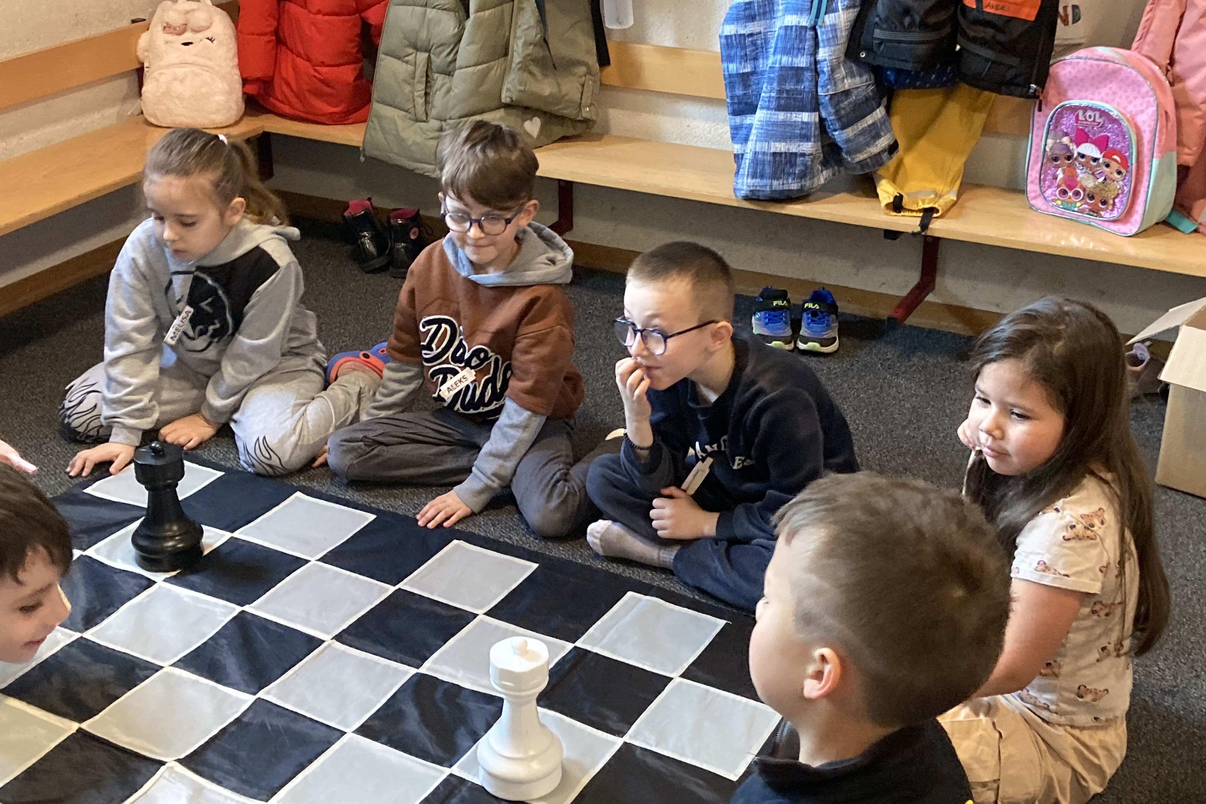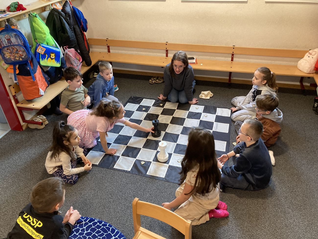 Zuerst wurde jeweils gemeinsam auf dem übergrossen Schachbrett geübt.