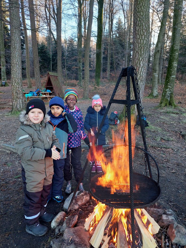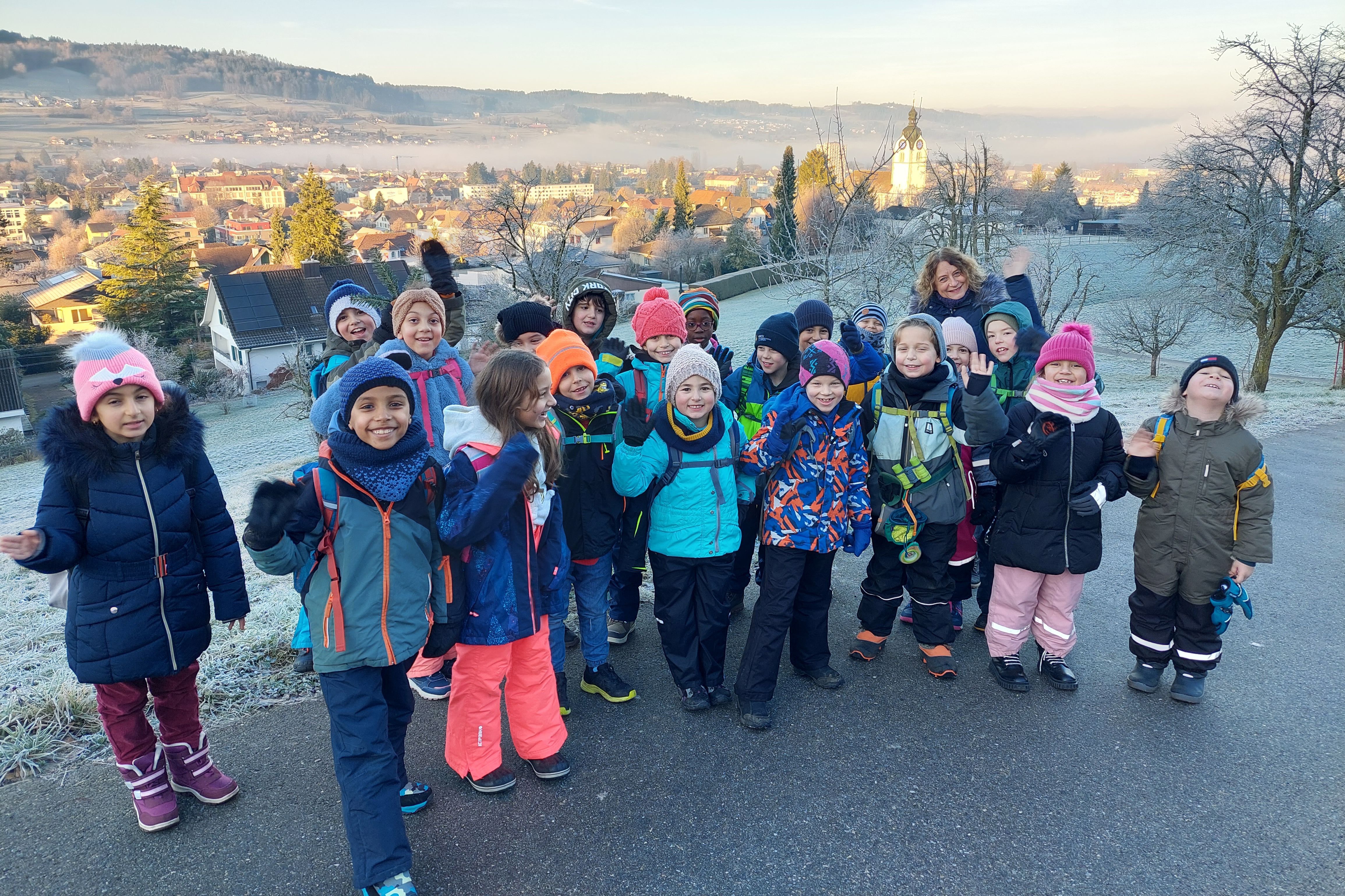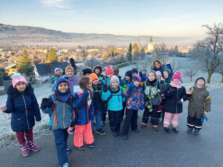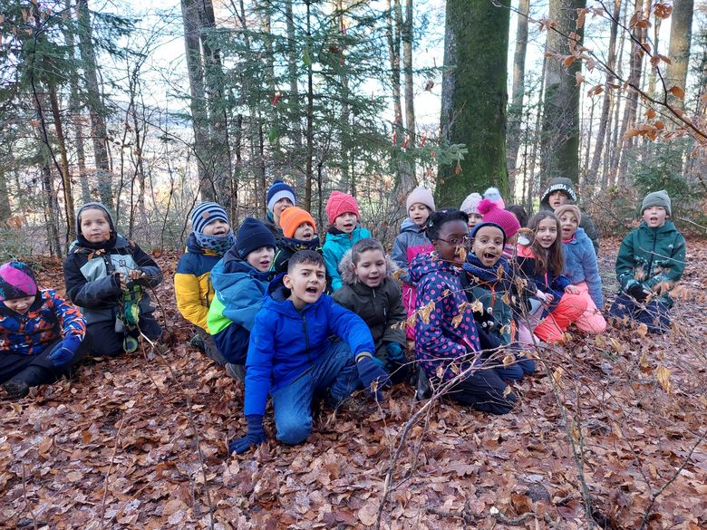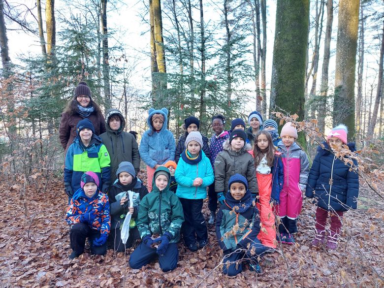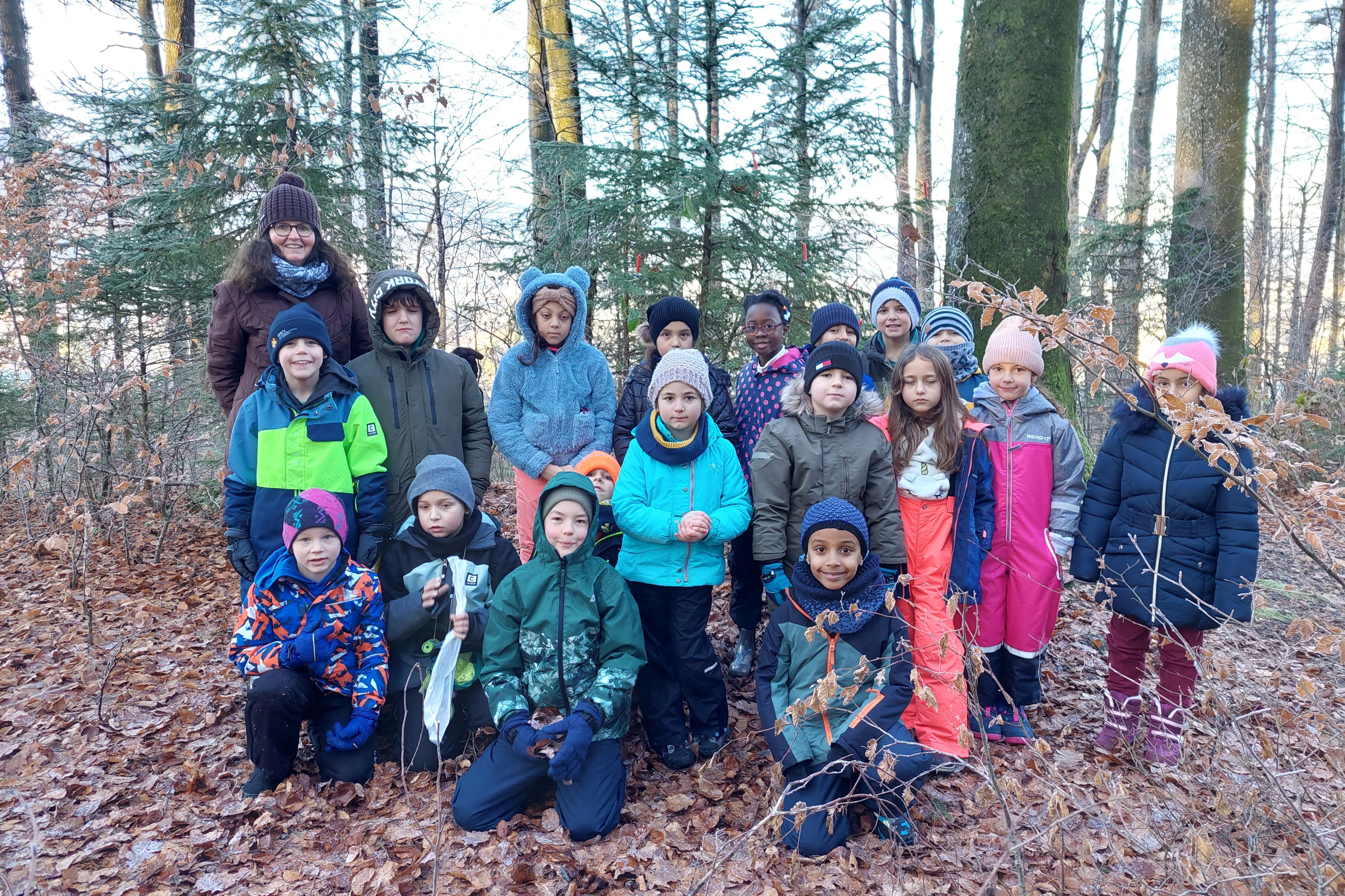 Die Kinder stellten selber aus Juteschnur mit Waldmaterial den eigenen Christbaumschmuck her. Zehn Kerzenhalter wurden mit Christbaumkerzen bestückt. Die Kinder sangen die geübten Weihnachtslieder und hörten eine Weihnachtsgeschichte. An einem grossen Feuer wurden Würste gebraten und man konnte sich aufwärmen. Der Wald war mit Raureif wie verzaubert. Auch Haareis konnten wir entdecken. Wir hatten viel zu staunen über die Kunstwerke der Natur. Die Klasse 2a und ihre Lehrpersonen kehrten glücklich zurück.