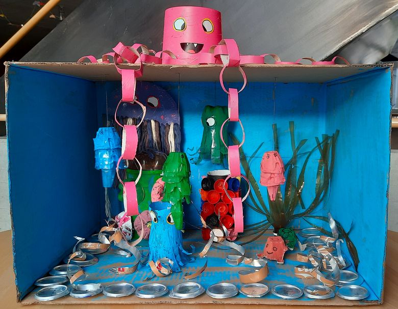 Einige bastelten zu Hause, andere verwandelten das Klassenzimmer in eine kleine Werkstatt. Es wurde geschnitten, geklebt, gemalt und getüftelt. Entstanden sind zahlreiche wunderschöne, fantasievolle und überraschend kreative Kunstwerke, die alle gezeigt haben: In Abfall steckt viel mehr, als man denkt!